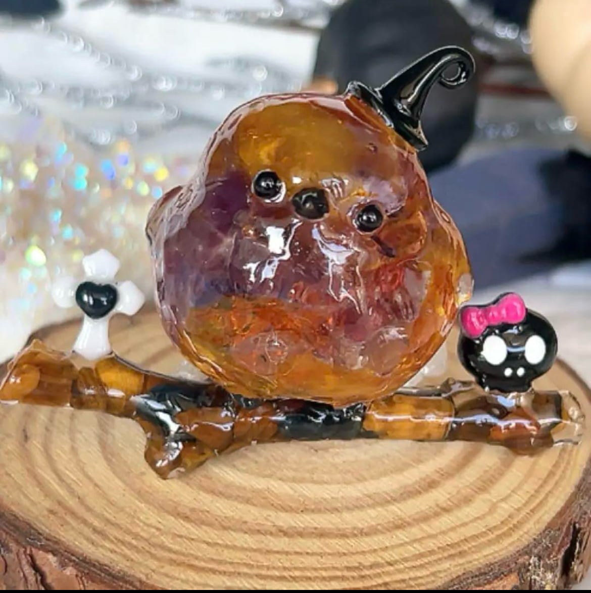 幸せを呼ぶオルゴナイト シマエナガちゃん♡ハロウィン 琥珀アメジスト 切株原石付き