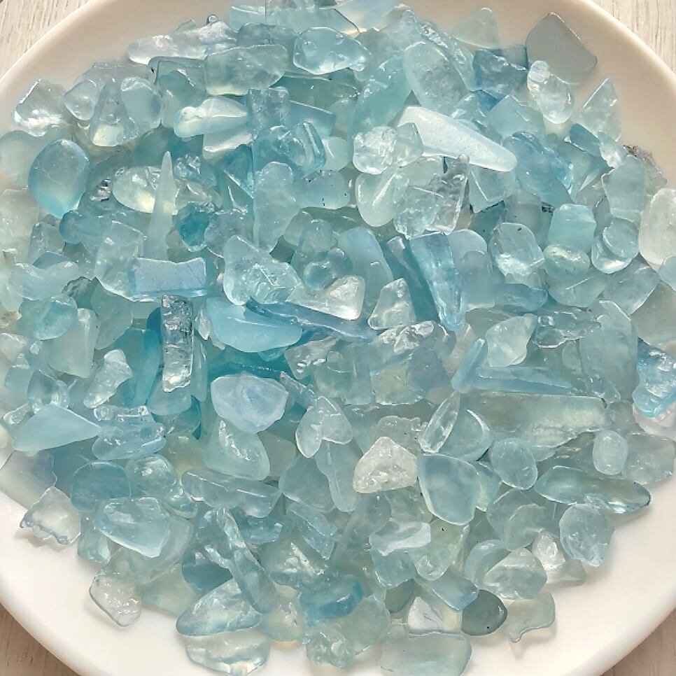 澄んだ水色がやわらかく、光を受けてきらめく天然石で、小皿やガラス容器に広げると空間に清涼感を添えてくれます。
